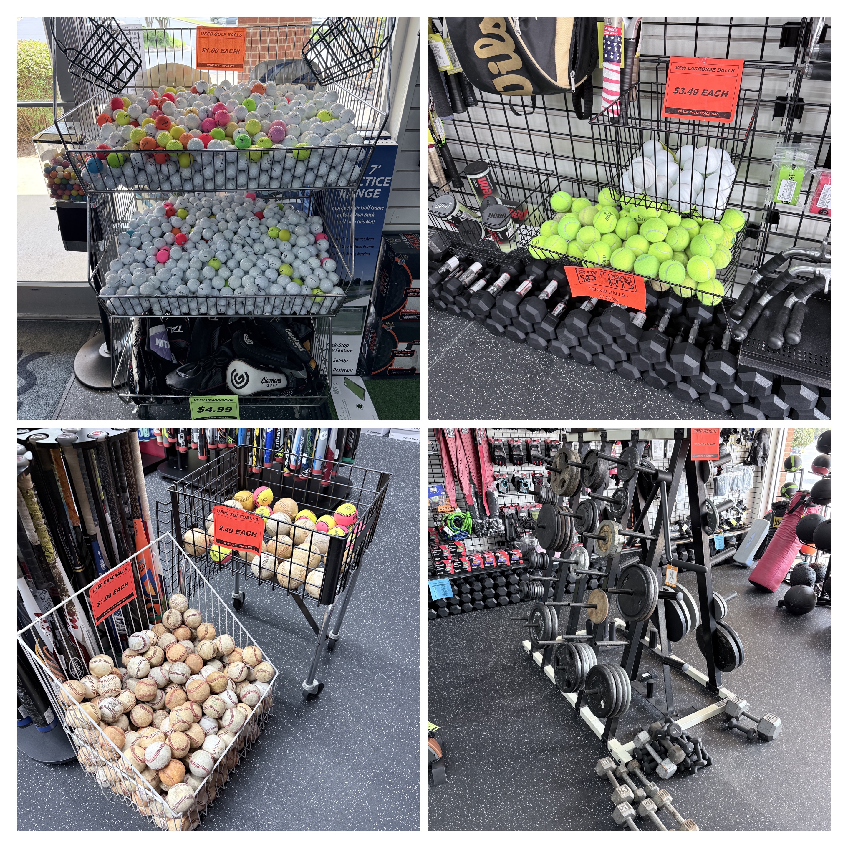 At Play It Again Sports, we buy and sell used balls and weights in bulk. You won’t see these listed online, but if you’re looking for range balls, practice balls, or a set of weights at a budget-friendly price, give us a call to check our current stock.